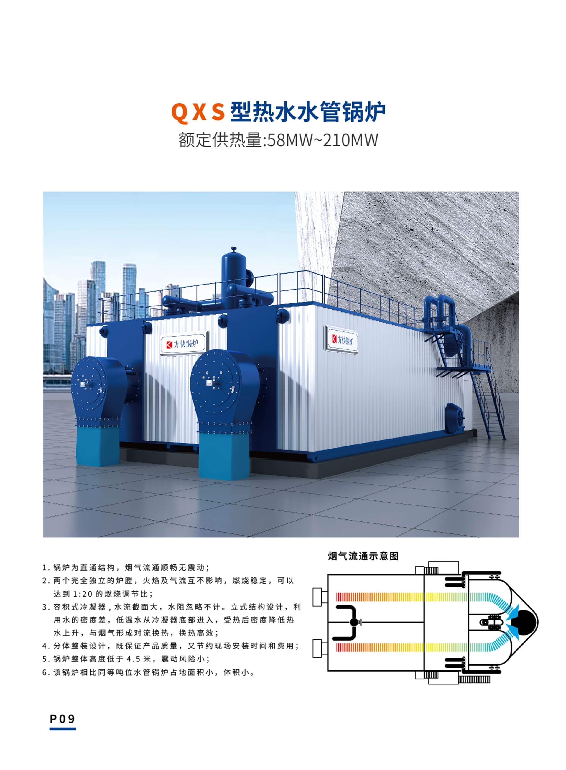 方快QXS型熱水(shui)水(shui)管(guan)鍋爐(lu)為直(zhi)通(tong)結(jie)構,煙(yan)氣流(liu)通(tong)順暢無震動(dong);兩個(ge)完全獨立的爐(lu)膛(tang),火焰(yan)及(ji)氣流(liu)互不(bu)影(ying)響,燃(ran)燒穩定,可以達到1:20的燃(ran)燒調(diao)節比;容積(ji)式(shi)冷(leng)凝器,水(shui)流(liu)截面大,水(shui)阻忽略不(bu)計(ji)。立式(shi)結(jie)構設計(ji),利用水(shui)的密度(du)差,低溫水(shui)從冷(leng)凝器底(di)部進入,受熱后密度(du)降低熱水(shui)上升,與煙(yan)氣形成對流(liu)換熱,換熱高效;分(fen)體(ti)(ti)整(zheng)裝(zhuang)設計(ji),既保證產(chan)品(pin)質量,又節約現場安裝(zhuang)時間和(he)費(fei)用;鍋爐(lu)整(zheng)體(ti)(ti)高度(du)低于(yu)4.5米,震動(dong)風險小(xiao)(xiao);該鍋爐(lu)相比同等噸位(wei)水(shui)管(guan)鍋爐(lu)占地面積(ji)小(xiao)(xiao),體(ti)(ti)積(ji)小(xiao)(xiao)。